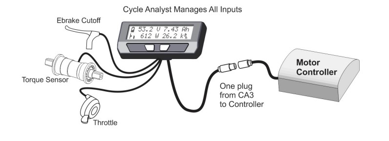 The main difference is that the Cycle Analyst can control the speed through a torque sensor on the crankshaft, while my system only can control the speed using a thumb throttle switch.