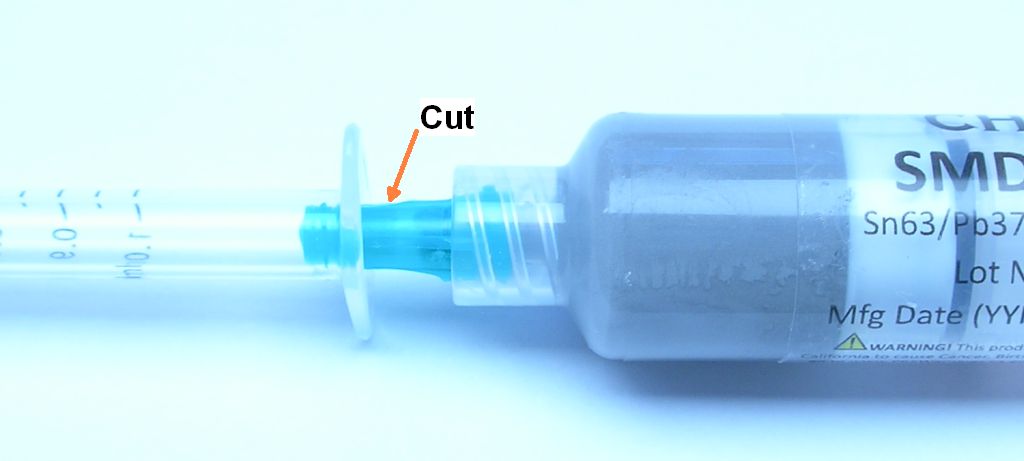 Normally the solder paste is packed in a thick syringe. Take the thin dispensing syringe and remove the plunger. Then spray a little paste into the thin syringe, 15 mm is usually sufficient. Then insert the plunger and push the pasta all the way down.